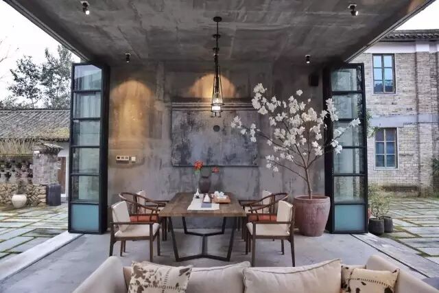 踩着小路石阶走进望松堂,栅格老木门、边上靠着久椅子,再配上枯枝,在灯光下实在太有味儿,既能当入口与天井的隔断,又瞬间让人接收到古村余韵。