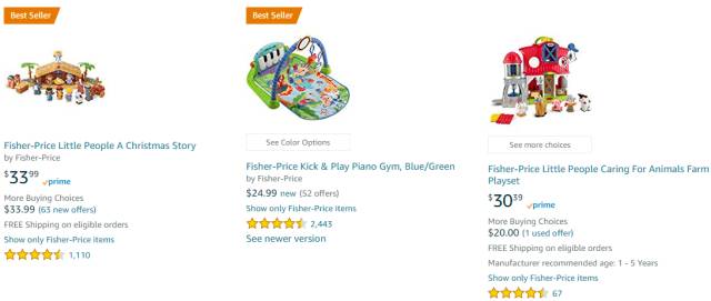 Fisher-Price 费雪公司自1930年代以来已经创造了大约5千种款式各异的玩具。费雪玩具最著名的玩具产品线之一是Little People(小人玩具),它是由小人和动物塑像(公仔)在不同的环境下如房子,庄园,学校,车库和小汽车等玩具部分组成。塑像(公仔),最初是木制和钩组成的人物,现在已经全部使用塑胶模具制造,并具有丰富的细节。