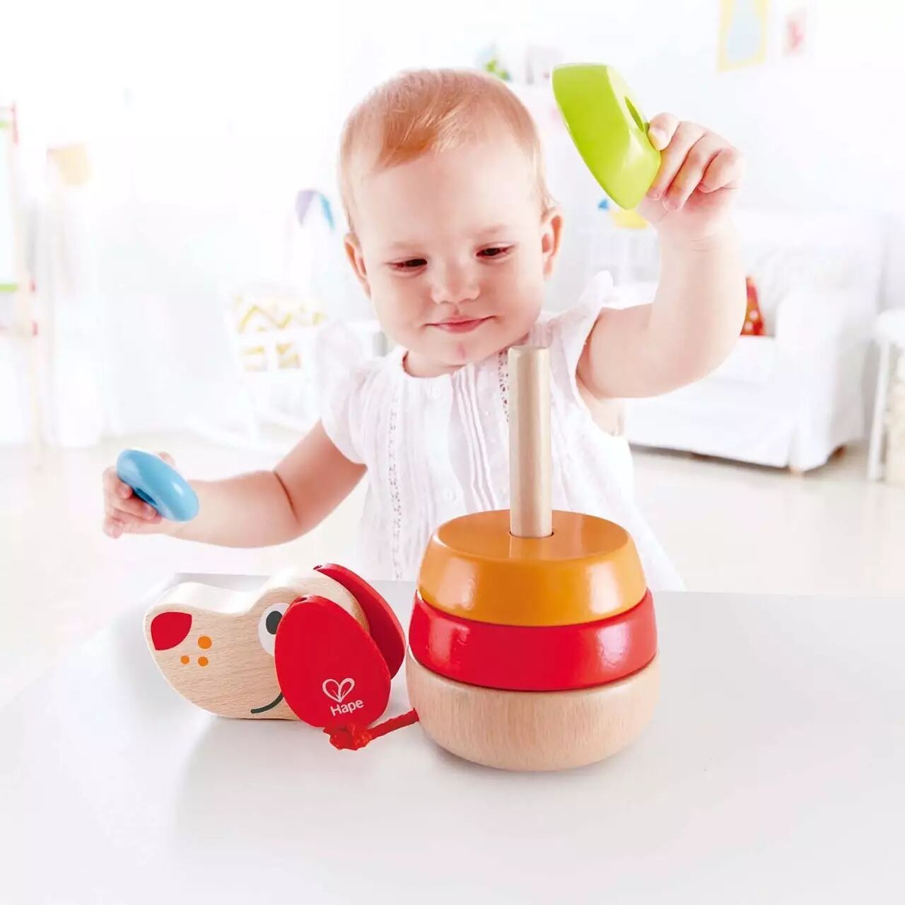 当宝宝对这款叠叠乐丰富的色彩和形状充满好奇的时候,他就会动手一个一个叠、套上去。