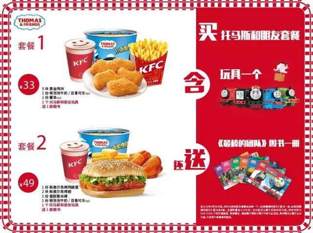 托马斯玩具除了给小朋友带来福音,还给宝妈奶爸们造福利。据说,从9月26日至11月20日,去肯爷爷家买33/49元托马斯和朋友套餐 ,6款玩具中的随机1款超棒玩具带回家,还送<最棒的团队>图书1册,全国首发新故事!好吃好玩好看,大写的实惠!讲真,一个玩具随随便便都要十几二十元,这次肯爷爷一个套餐就送贴纸、玩具和书,也是业界良心!