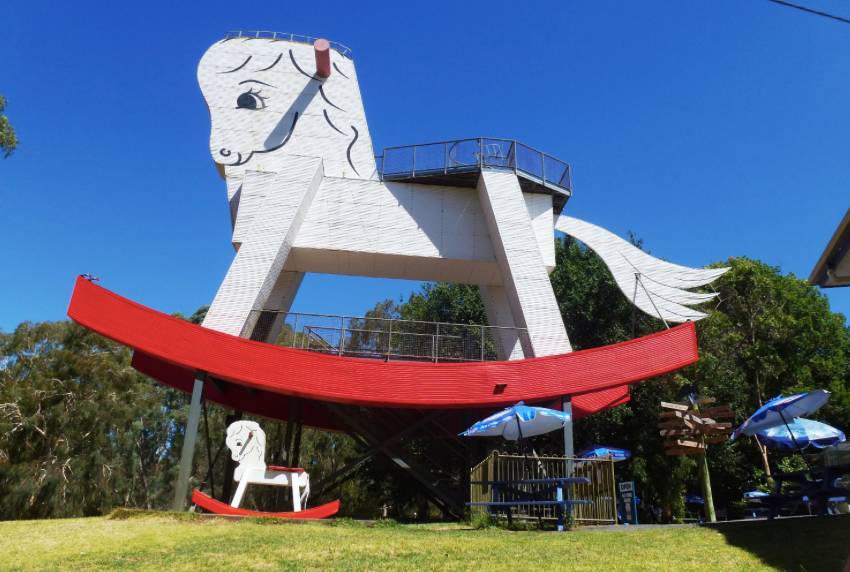 前往神奇木马工厂参观18.3米世界最大的巨型摇摆木马(Big Rocking Horse)与Gumeracha玩具厂,然后在旁边的丛林公园(门票$1,Bush Park)里面观看一些澳洲特有的动物,袋鼠、羊驼、鹦鹉等。