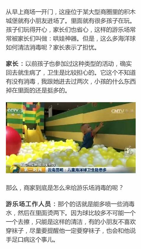如今大型商圈里设置的儿童乐园越来越多,海洋球更是商家吸引小朋友的手段,,。目前又正值手足口病高发期,儿科医生介绍,没有严格消毒措施的儿童游乐场所存在不小的感染风险。