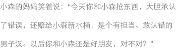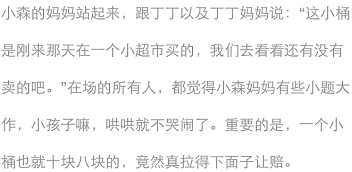 让我们大跌眼镜的是,小森妈妈把女儿的意见重复了一遍:“你想让丁丁买一个一模一样的小桶给你,对吗?”小森点点头。妈妈又问:“买回来你就原谅丁丁了,对吗?”小森答:“嗯。”