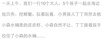 丁丁妈妈上来阻止,也没能把冲突降级:小桶的拎手掉了,桶里的小鱼、小虾、贝壳散落一地,小森和丁丁同时大哭……