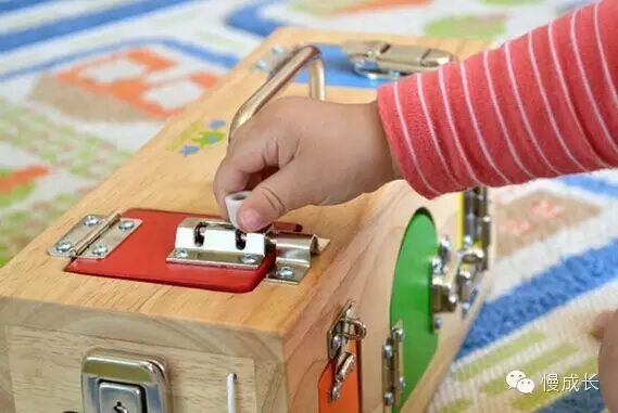 1-2岁的宝宝对许多生活场景感兴趣,例如倒水、喝水,例如打扫,其实这些都可以锻炼孩子的眼手协调能力,而其中较为精细的就是用钥匙开门,孩子要学会操作稍微细小且需要严格对应的东西,并且要完成一组指定动作而不是单一动作:捡起钥匙——找到锁孔——准确插入钥匙——转动钥匙——拉开小门。