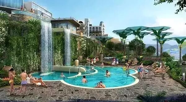 室外坡地园林景观泡池区以坡地景观独有的趣味性为依托,随山势逐渐降低,60余个室外景观泡池错落有致的散布其中,是目前云南市场上总量最多,总面积最大的泡池群落。