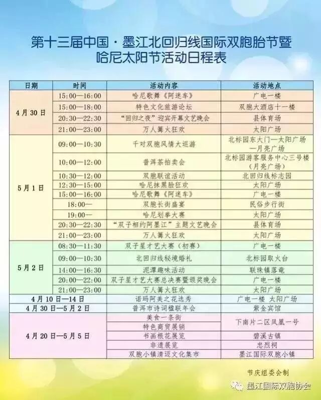 在提升主题晚会、双子星才艺大赛、万人篝火晚会、双胞巡游、哈尼抹黑脸、双胞长街宴、哈尼划拳大赛、泥潭趣味活动、哈尼秘境婚礼、双胞联谊等经典活动的基础上,新增了诺玛阿美之花选秀、精品文化剧目展演、企业舞台、斗茶大赛、摄影大赛、书画根花展览、文化旅游论坛、诗词楹联年会、时尚秀场等精彩内容。