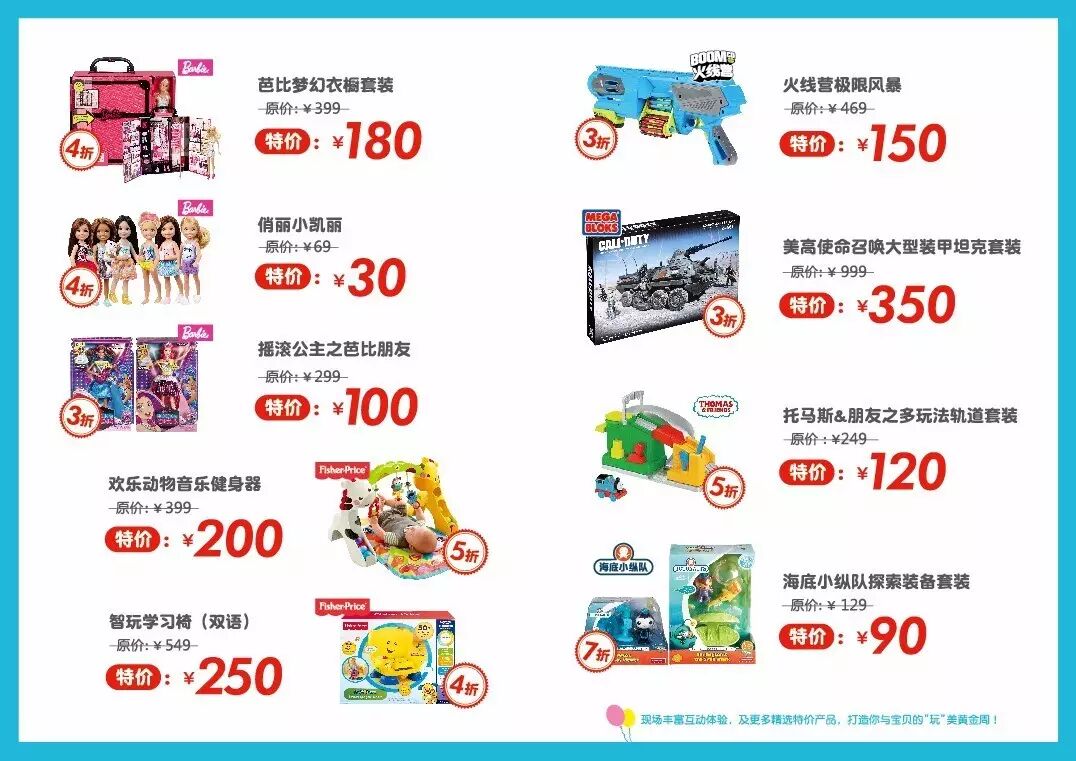 美泰首次登陆国内奥特莱斯,现场不仅有美丽的芭比,经典的小火车,更有超多折扣单品可以一次拥有,宝贝爱不释手的经典玩具低至30元!超低价献礼,你值得拥有,宝妈宝爸们,快来为宝贝们送上一份中秋小礼物吧~