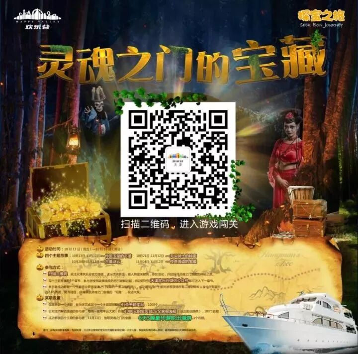 活动参与:欢乐时光入口处领取活动DM单,扫描二维码关注天津欢乐谷微信号获取活动线索,完成任务,获得大奖。
