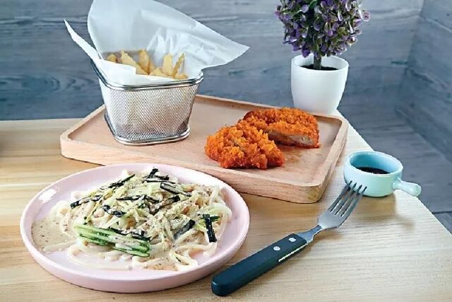 Rabbitland Cafe虽小,但冷热饮、小食、冷盘、意粉、拼盘各类食物都有,单点28-68港币内。还有98港币、138港币、169港币的套餐,包饮品、食物及兔仔小食。