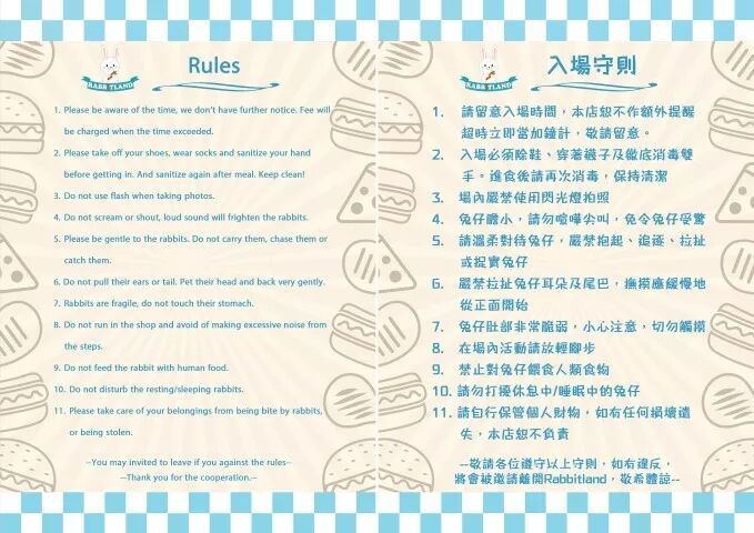 Rabbitland Cafe自开张后生意一直很火爆,想去最好提前预约!而且提醒大家,周六日设1小时入场时限,超时每半小时加收20港币,1小时加收30港币,但如果点套餐就不限时啦!