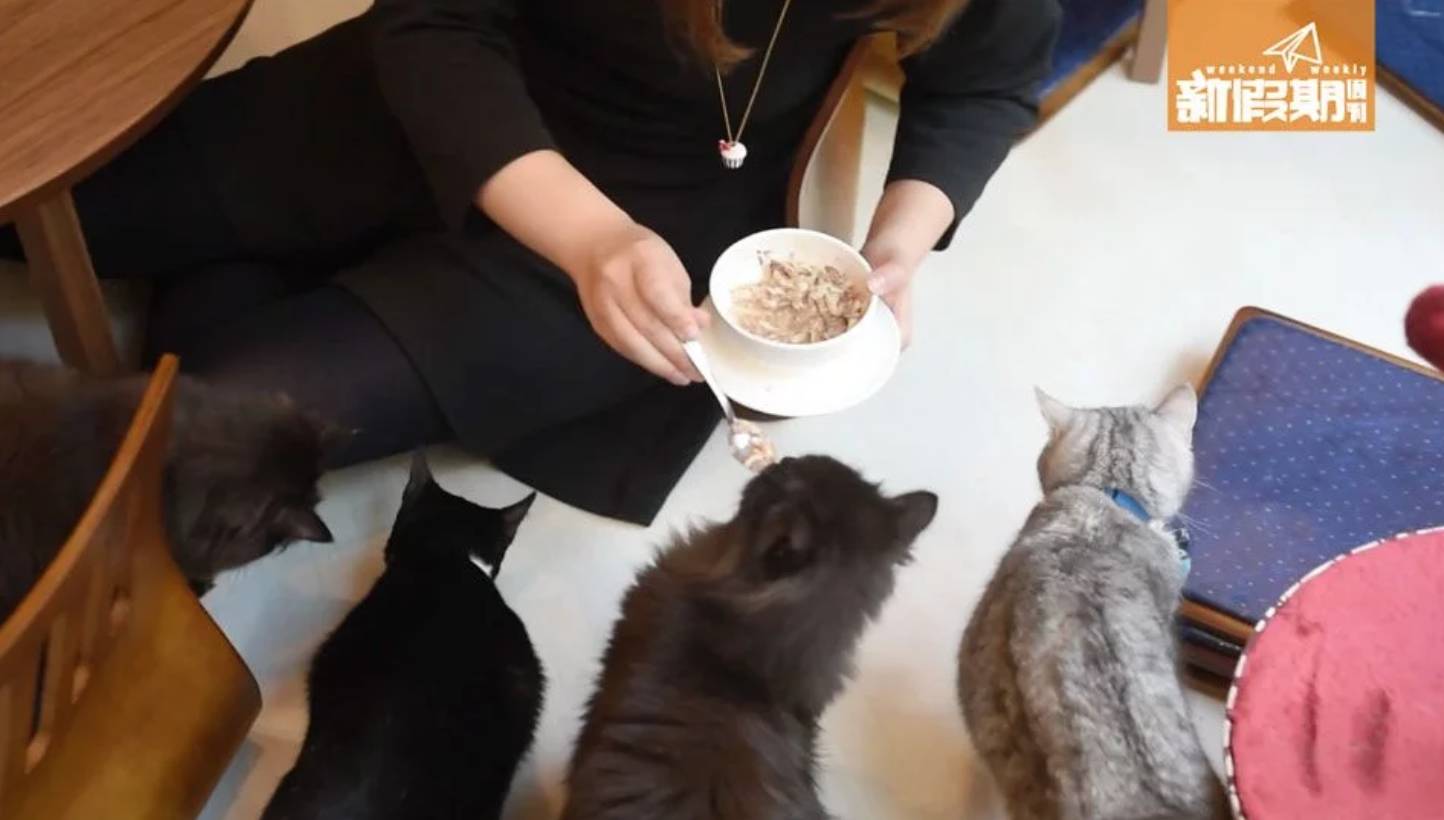 如果想吸引猫,可以花25港币买一碗南瓜鸡,或者鱼鱼鸡。接着你就会看到女皇波波、则士、咕咕等一大波猫猫全向你涌来: