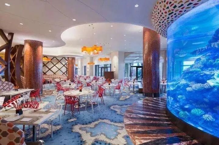 餐厅里有两个大鱼缸,边就餐边观赏