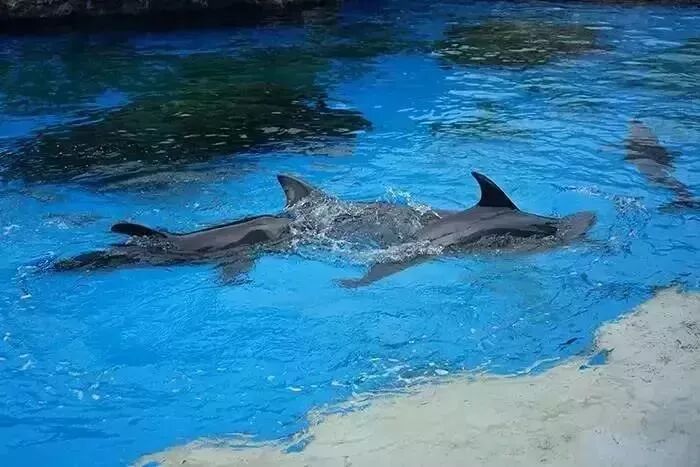 在海豚剧场,你可以看到十几条海豚在水面上飞来飞去,蔚为壮观。