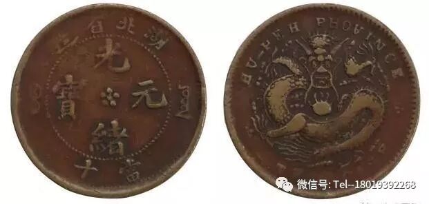 钱面:珠圈内满汉文“光绪元宝”,圈外上环“湖北省造",下环“库当十”注解币值,旁边各一六瓣花星。钱背:中间为蟠龙图,上下环英文,旁边各一六瓣花星。