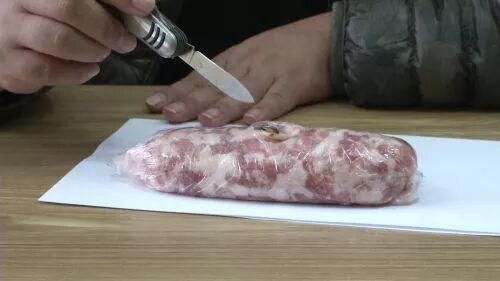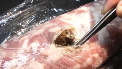 记者看到,嵌在肉肠里的纽扣电池已经发黑,而跟电池接触的部位,肉肠的颜色也发生了很大的改变,特别是纽扣电池的边缘部位,肉质发黑发绿更为明显。