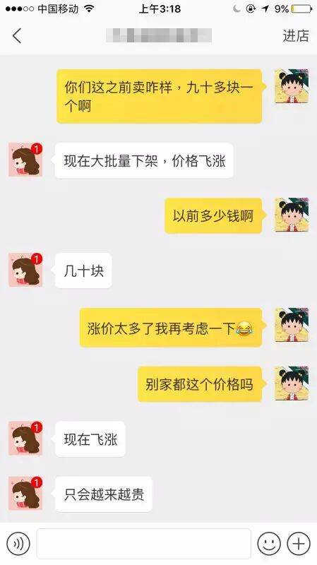咨询中,该商家承认之前这款商品只卖“几十块”,但“现在大批量下架,价格飞涨,只会越来越贵”。