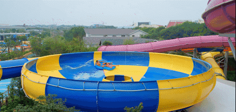 从十几米高的平台缓缓进入滑道,在重力和水流的作用下,加速下滑,尖叫声中得到的刺激感受。