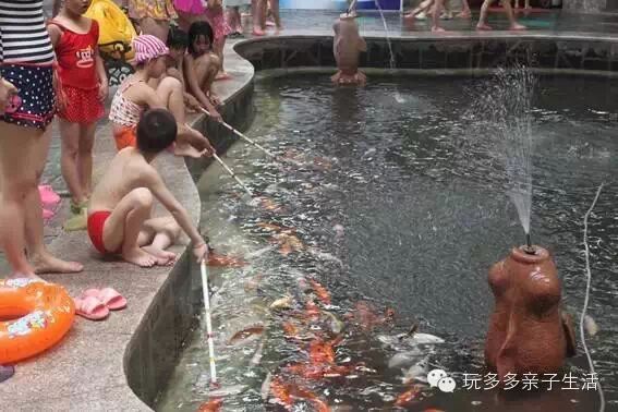 吃奶鱼吸引了很多小朋友,温泉泡累了就来嬉戏小鱼