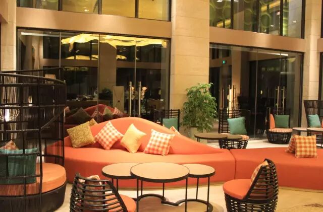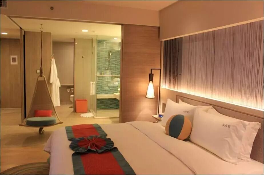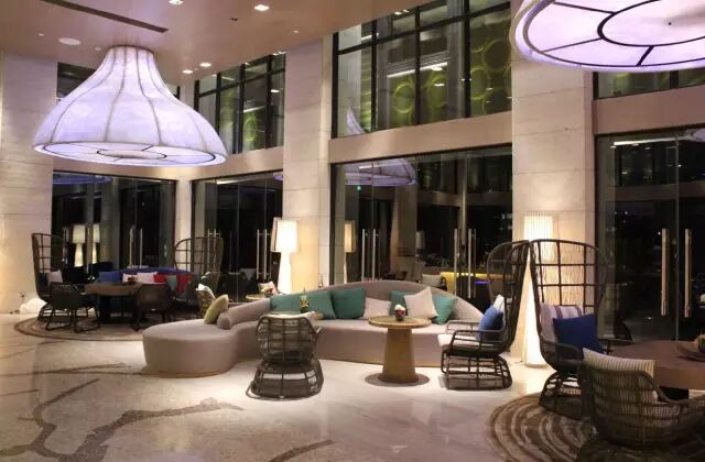酒店整体设计风格简约大方,将南国热带滨海风情融入园林之中,充满海岛特色。大堂简洁、时尚,藤制的吊椅、撞色的布艺抱枕、仿大理石纹理的抛光地面、蝉蛹创意的顶灯、生机盎然的植物墙,在踏入时即感自然清新。