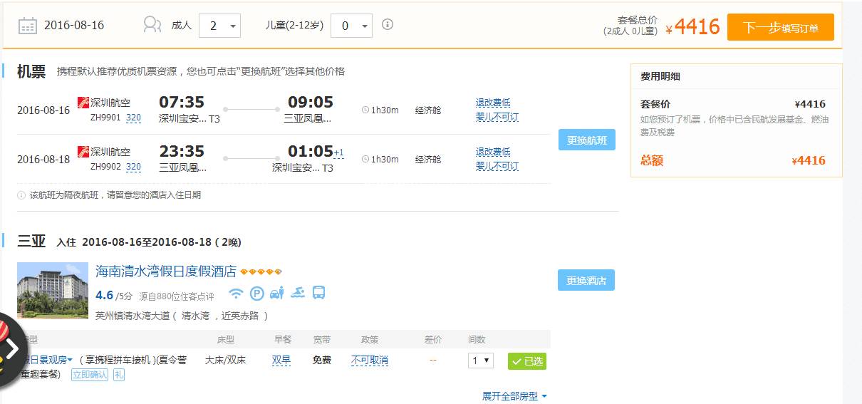 去程:深圳-三亚ZH9901 07:35-09:05