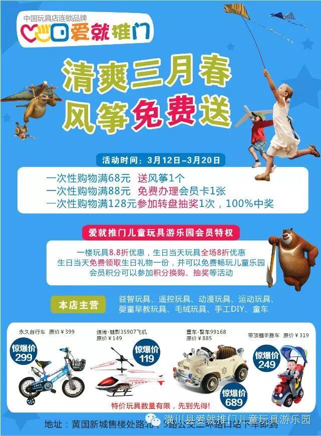 活动期间玩具一次性消费满68元就可以免费领取风筝一个,一次性消费满128元,还可以参加幸运转盘抽奖,100%中奖!