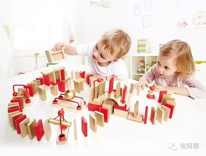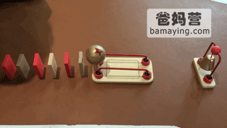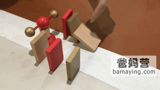 下面这个杠杆,要成功使用它,只有把木块放在平衡木同侧才可以。这里面蕴含的是物理学中的受力原理,大一些的孩子就可以边玩多米诺骨牌,边学习科学知识了。