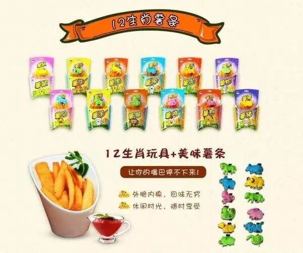 除了小船薯之外,美家食品还有独特创意性的十二生肖薯条,将传统的十二生肖文化,十二生肖玩具和薯条结合在一起。