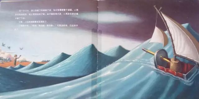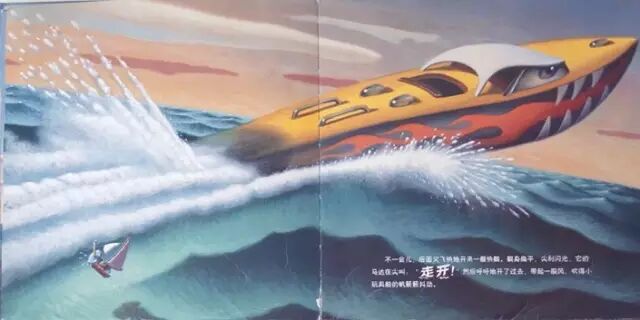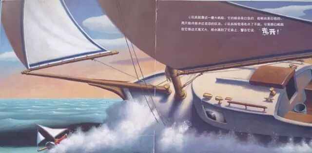 小玩具船靠近一艘大帆船。它的船身是白色的,船帆也是白色的。两只船并排冲过滔滔的巨浪。小玩具船觉得有点了不起。可是那白帆船在它旁边又高又大,把水溅到了它身上,警告它说:“走开!”