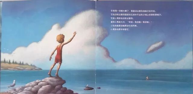 它觉得一切都太棒了,简直没注意到渔船已经开走。它也没有注意到面前的石岸和不远处沙滩上的那张黄椅子。它连小男孩也没有注意到。