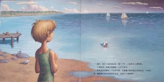 每天,他们一起到湖边玩,整个下午,小船在水上漂啊漂。小男孩用一根绳子牵着船,从来不放手。船觉得这样挺好。不过有时候,它看着大船在湖上来来去去,不由得想,像那样自由自在的来来去去,会是什么感觉呢?