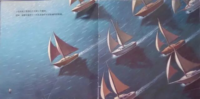 小玩具船只觉得自己又渺小又害怕。这时,迎面又驶来了一大队急急忙忙回家避雨的帆船。