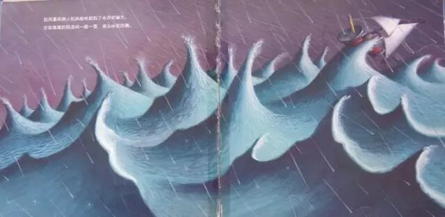 狂风暴雨把小玩具船吹赶到了水深的地方。它在高高的巨浪间一起一落,浪溅水花四溅。