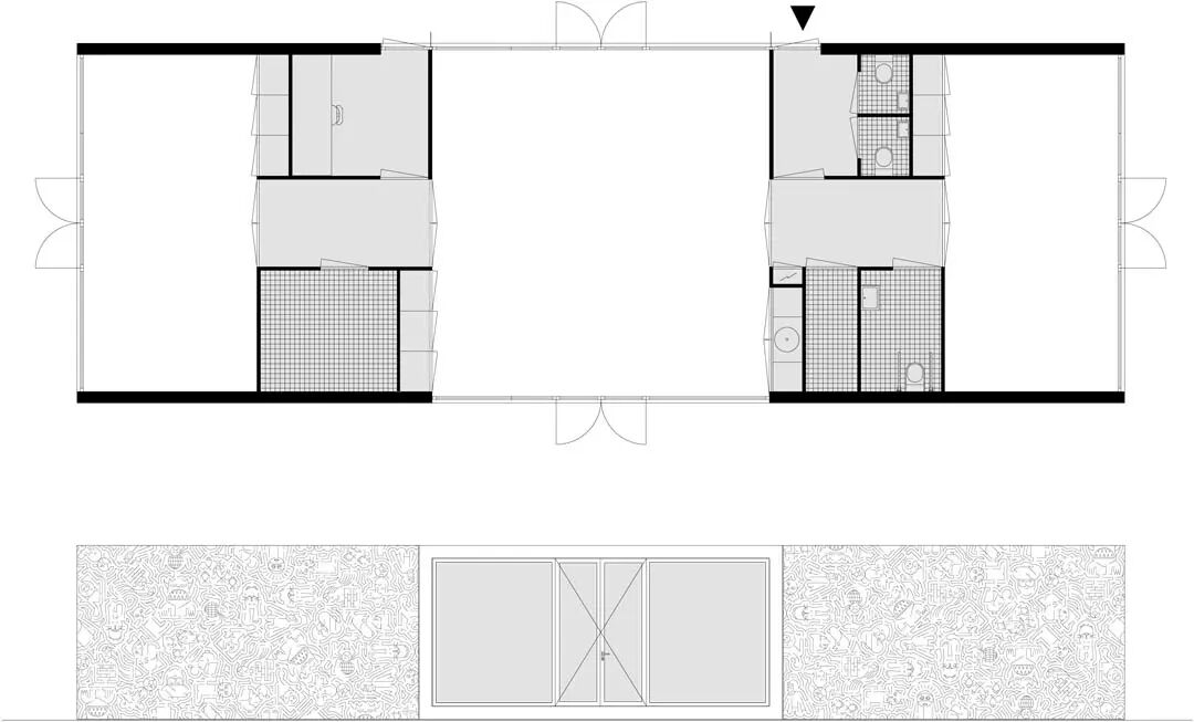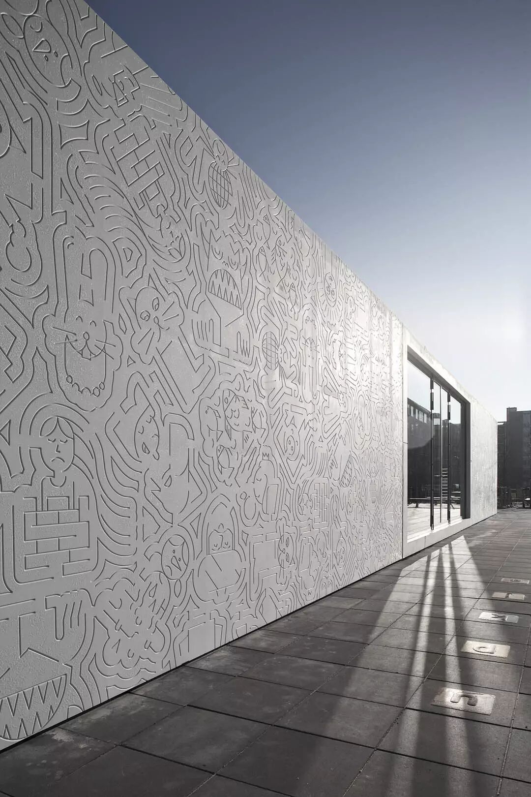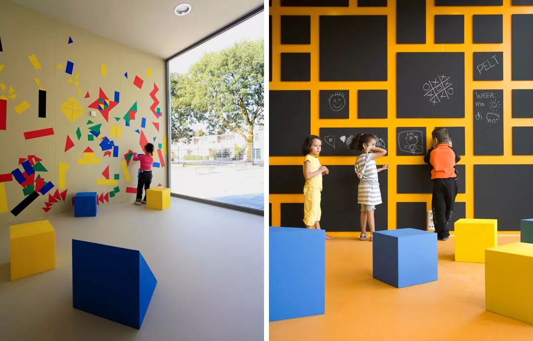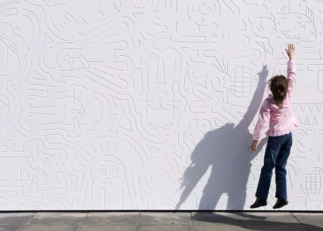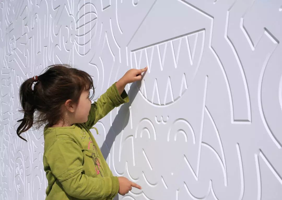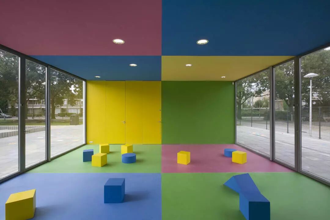 建筑坐落在一块空地中,将操场分成两块,一边是青少年场地,一边是幼儿场地。中间的游乐设施有三个独立的,色彩绚丽的互动游戏室。每个房间都非常有特色,邀请孩子们在其中玩耍,发现,创造。和多彩的内部相比,建筑的外观是宁静的白色。大幅的墙面上刻着线条,仔细看,可以看出一些图案。这些图案均来自世界各地的童话故事。建筑师希望这个设计可以激发孩子们的感官和想象力。