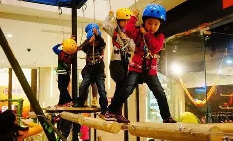 在一些大型购物商场里,儿童拓展运动也悄然兴起。经常可以在商场内看到,十几个小朋友头戴着安全帽,身上扣上保险带,在玩走木桥、攀绳索等拓展运动,引来许多的围观。
