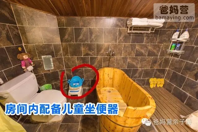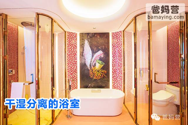 亲子房内的卫浴间也都是卡通设计十足哦,干湿分离的浴室,还配有大浴缸,爸妈们可以在这充满童趣的卫浴间里帮小朋友洗澡!