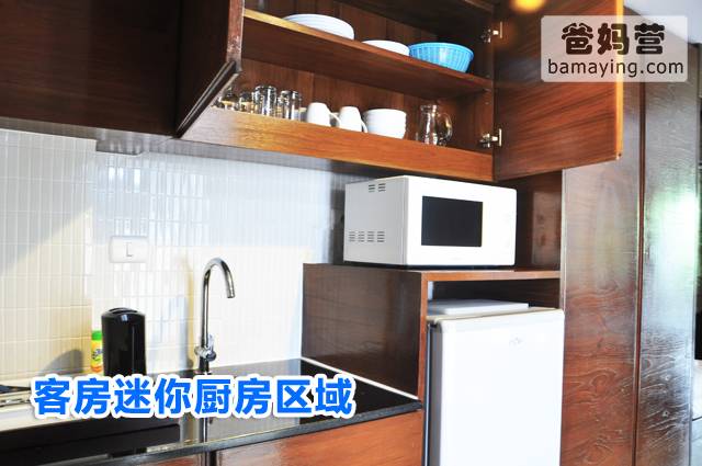 【Studio】还配备迷你厨房区域,有微波炉、冰箱以及盘子,杯子,刀叉,勺子等餐具。爸妈们如果有兴致自己抄个菜的话,工具一应俱全。洗手池下面还放了宝宝洗手凳子,非常贴心。