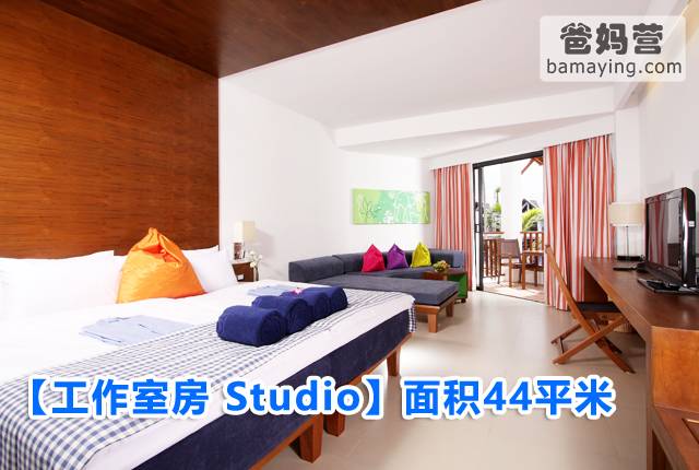 酒店【工作室房 Studio】房间面积44平米,内设1.8米床1张或1.2米床2张,客房配有一张可卧的沙发床及室外阳台。很适合带老人或二胎家庭。