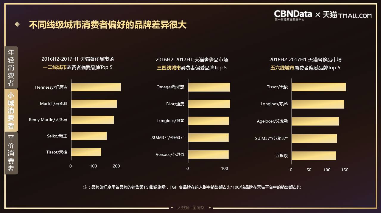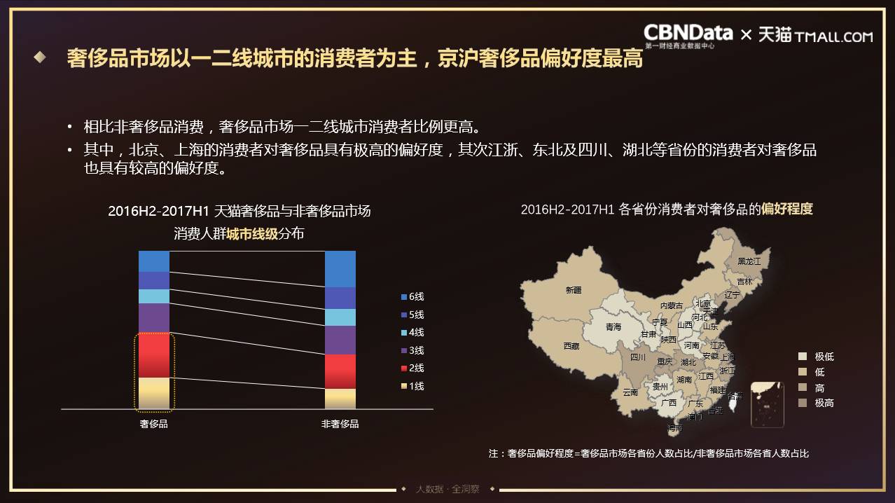 奢侈品牌通过天猫触达了更多的客群,与此同时,也让原本仅在一线城市开设线下店铺的奢侈品牌得以将商品卖给更为下沉的地区。根据CBNData《报告》显示,奢侈品市场中各线级城市消费者的件单价逐年增长,其中,三至六线城市消费者购买奢侈品的件单价在2015年已超过一二线城市消费者。与此同时,线上奢侈品消费增速TOP10城市也几乎均为三至六线城市。