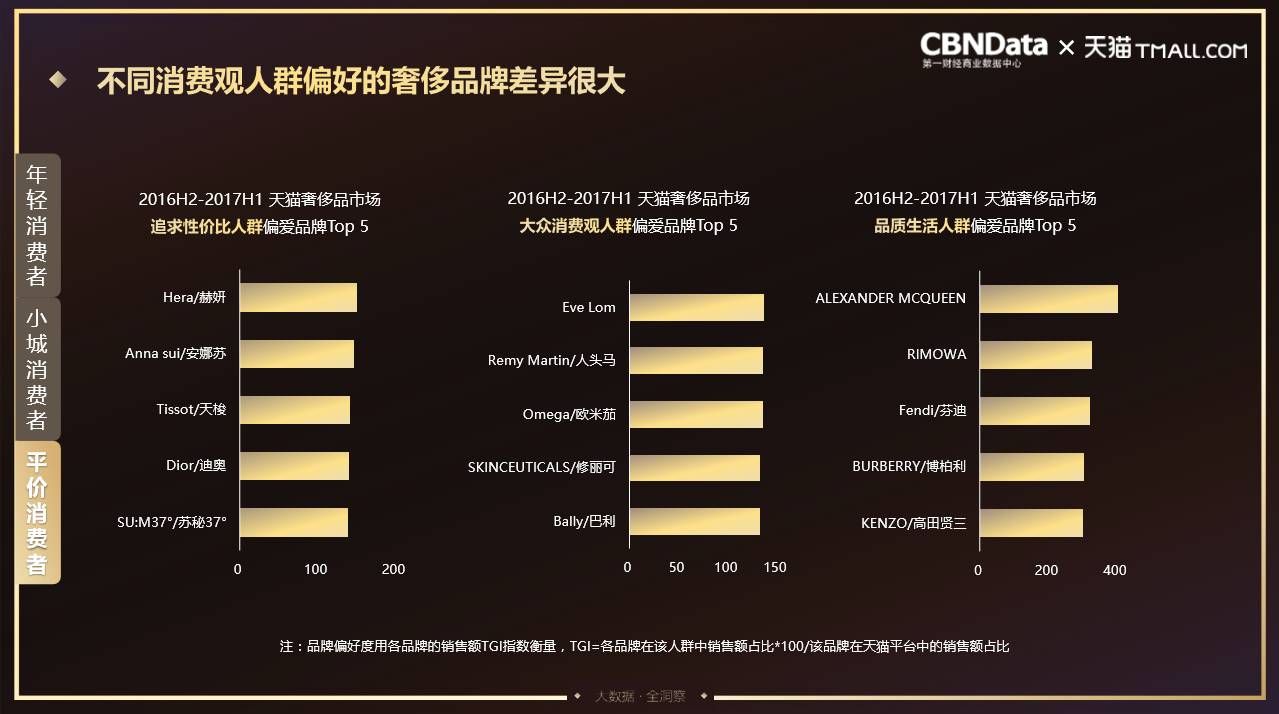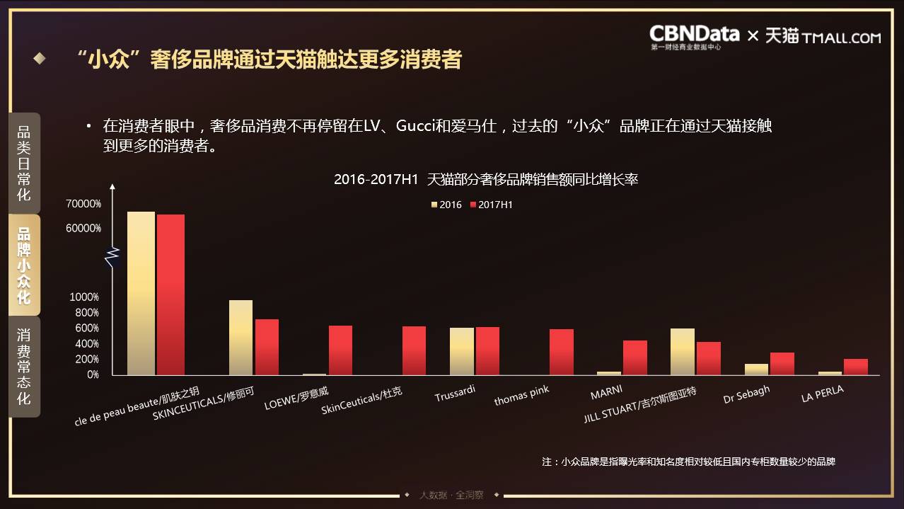 随着各大奢侈品牌选择进驻天猫,消费者的选择不断增加,一些在中国市场接受度不算高的奢侈品也顺势选择通过天猫来获取更广泛的群众认知。根据CBNData《报告》显示,在消费者眼中,奢侈品消费不再停留在LV、Gucci和爱马仕,过去的“小众”品牌如今正在通过天猫接触到更多的消费者,极大丰富了奢侈品供给,同时帮助这些品牌吸引了更多年轻消费者。以日本高端美妆CPB为例,2016年7月,CPB正式入驻天猫,为了更好满足天猫拥有的年轻消费群体,并前所未有地把包含8款新品的新一季护肤系列放在天猫美妆首发,并且还推出了两款更符合天猫年轻用户的专供护肤套装。