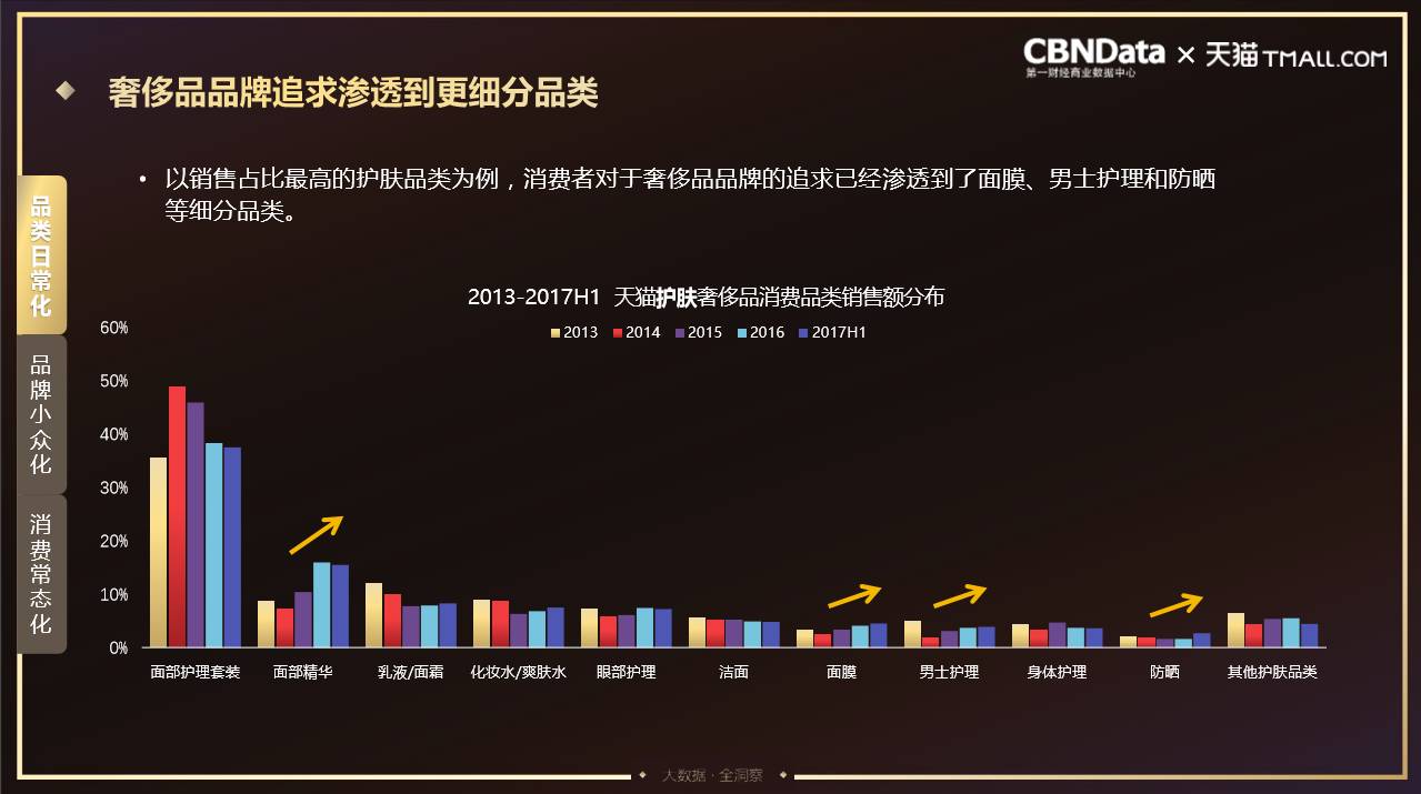 在触及电商之初,奢侈品们往往选择“上线”旗下知名度较高的品牌以及畅销单品,而随着线上市场的逐渐完善,奢侈品牌开始陆续丰富线上品类,逐渐覆盖消费者生活的方方面面。根据CBNData《报告》显示,相较于2013年,奢侈品消费品类结构中酒类和手表占据近4成的比例,2013-2017H1期间日常消费的护肤/彩妆占比逐年上升。其中,以销售占比最高的护肤品类为例,对于奢侈品牌的追求已经渗透到了面膜、男士护理和防晒等细分品类。可见,对于消费者来说,奢侈品不再限于场景化消费,而是成为日常生活的一部分。