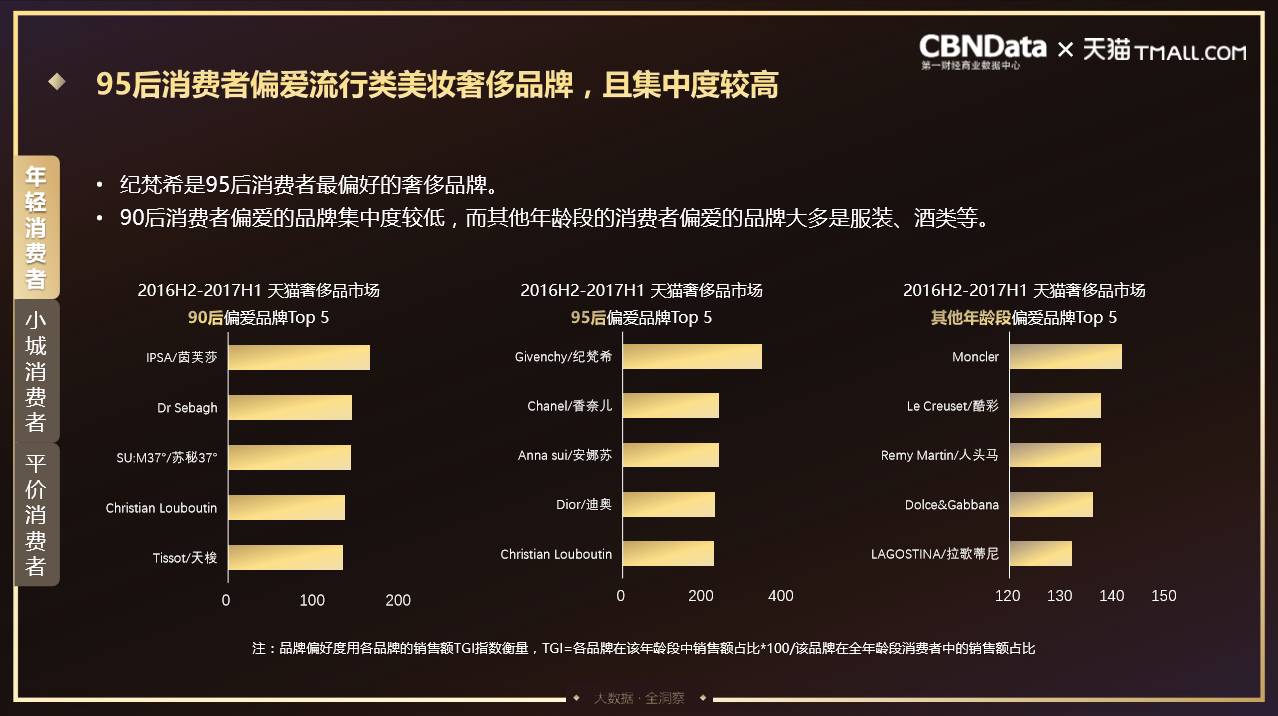 在当下中国线上奢侈品市场中,70后、80后可谓是中坚力量,不过未来,90后、95后的线上购买力也不容小觑。根据CBNData《报告》显示, 2013年到2017H1期间天猫奢侈品市场90后人群稳步增长,95后人群增速迅猛,其中美妆和手表奢侈品更受到到90和95后消费者的偏爱,相对而言,95后的奢侈品花销集则中在美妆领域,其中纪梵希属95后最为偏好的奢侈品牌。