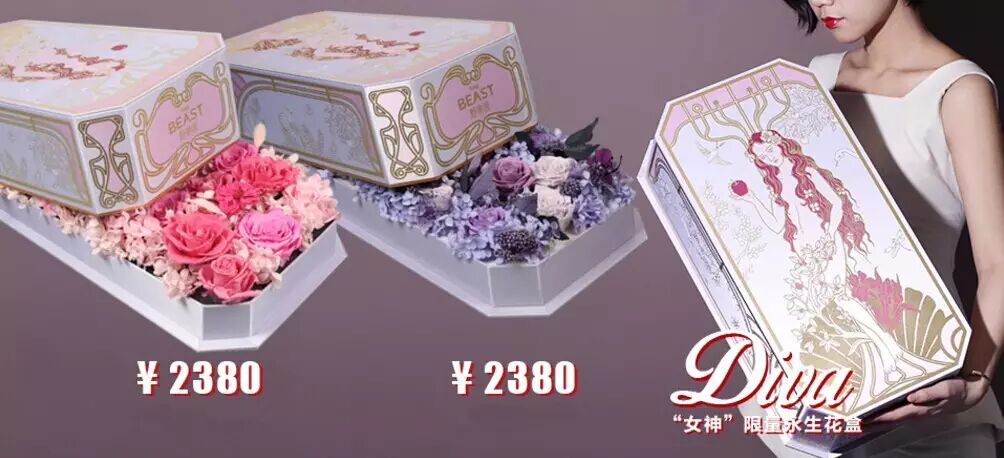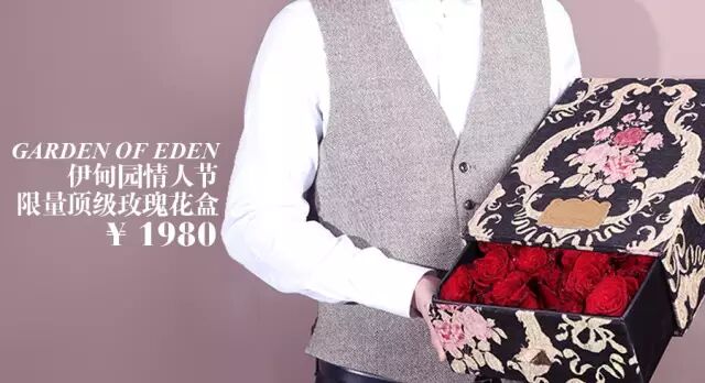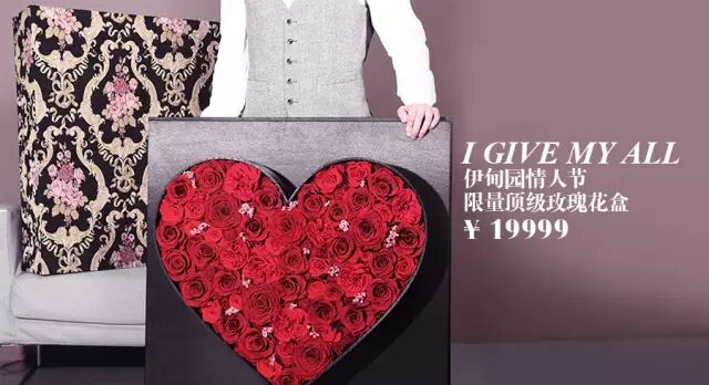 鲜花款是1980元,盒子像一封巨大的信,写满情话;永生花款是超大的爱心花盒,完全为满足虚荣心而产生的作品,需两个壮汉抬,平躺就是个一米见方的小桌子。可怕的是,它如此劳命伤财,却注定是很多女人一辈子难忘的情人节礼物。