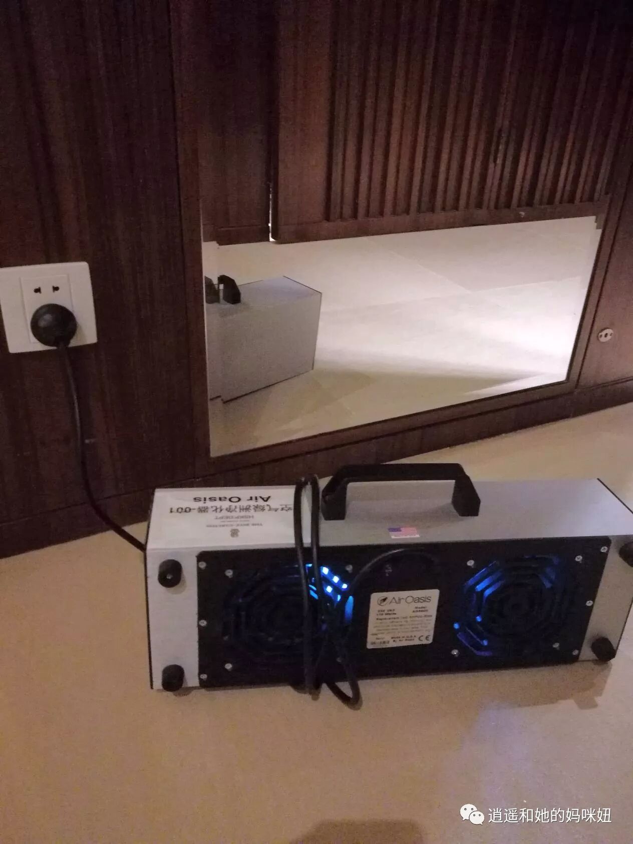 住酒店的时候有个小插曲,逍遥对地毯过敏,晚上在房间鼻子不通,睡觉的时候呼吸音也很重,我打电话给前台问有没有不带地毯的房间,回复说没有,但是可以给我们拿一个空气净化器,就是下图这个。开的时候声音很大,所以睡觉的时候也不能开。。。