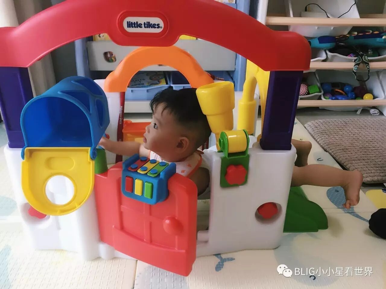 那时候还只能从门里钻进去,现在都可以迈进去了…每次可以在里面玩很久,打打电话、玩玩小球,开开小窗,看看望远镜,扶着四周走路…不论是对宝宝大运动发育还是认知启蒙,都有一定的益处。