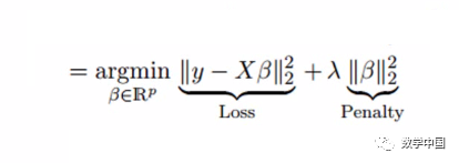 在这个公式中,有两个组成部分。第一个是最小二乘项,另一个是β2(β-平方)的λ倍,其中β是相关系数。为了收缩参数把它添加到最小二乘项中以得到一个非常低的方差。
