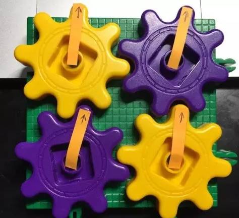 逻辑训练就可以这样进行,比如我们可以给每个齿轮贴上箭头便签,让孩子仔细观察,一个齿轮转动时,其余3个齿轮分别是什么状态。